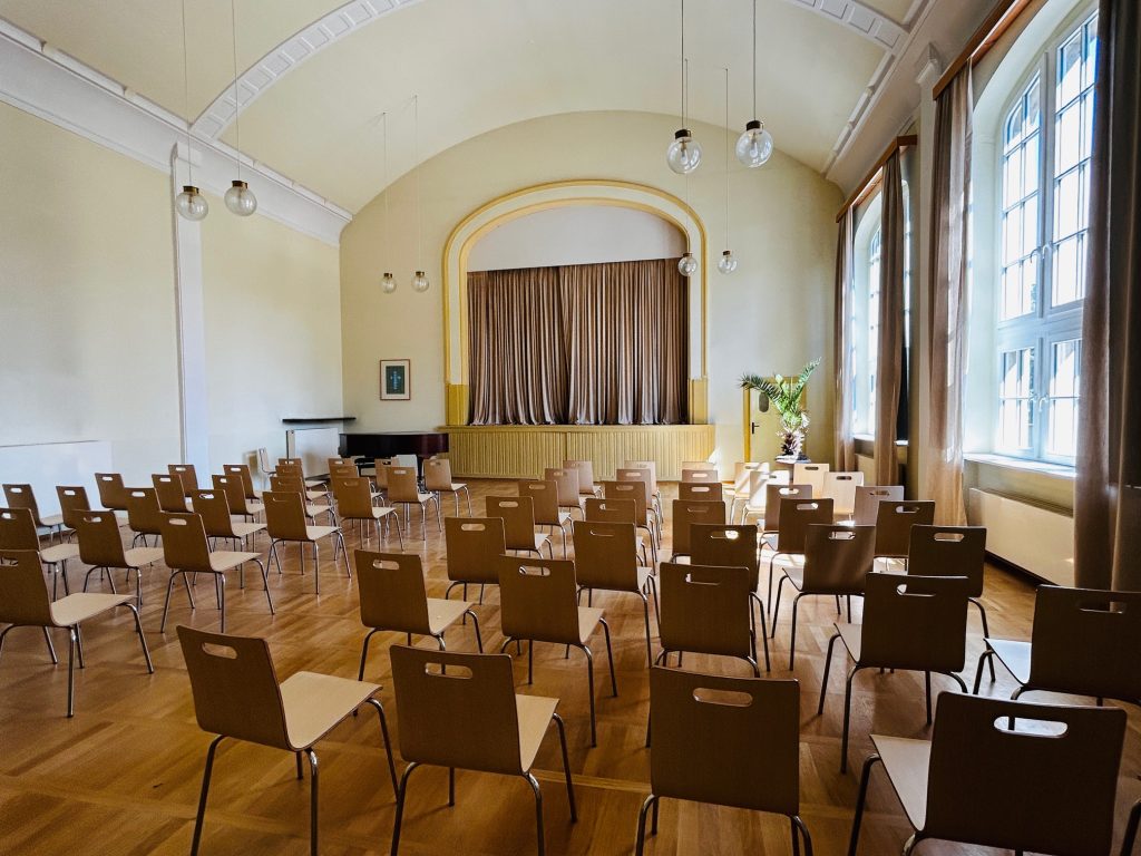 Der Große Saal im Dietrich-Bonhoeffer-Haus bietet Platz für bis zu 80 Personen. Die Bestuhlung können Sie individuell vornehmen, Tische und Stühle sind vorhanden.